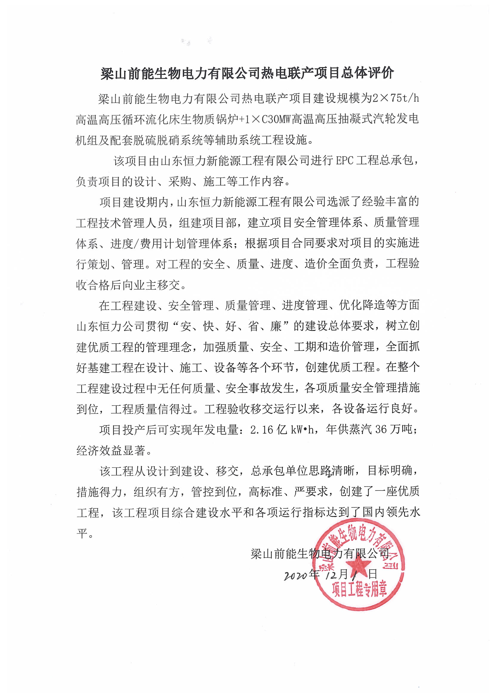 2020年12月1日,我司收到梁山前能生物電力有限公司針對熱電聯(lián)產(chǎn)項目的總體評價,再次得到業(yè)主的高度好評!