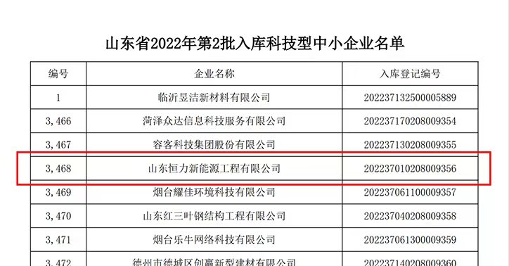 山東恒力新能源工程有限公司成功入庫(kù)山東省2022年第二批國(guó)家科技型中小企業(yè)。
